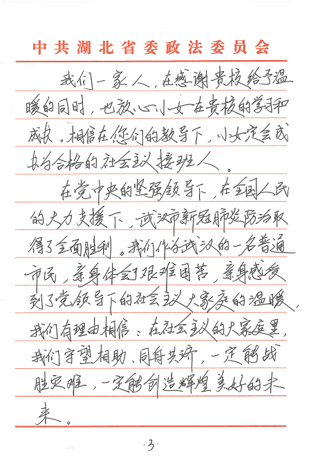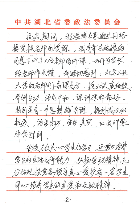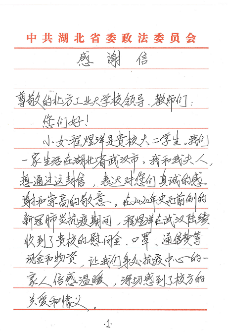 “小女程煜洋是贵校大二学生。我们一家生活在湖北省武汉市。我和我的夫人,想通过这封信,对您们表达真诚的感谢和崇高的敬意。在2020年史无前例的新冠肺炎抗疫期间,程煜洋陆续收到了贵校的慰问金、口罩、通信费等现金和物资,让我们身处抗疫中心的一家人倍感温暖,深切感到校方的关爱和情义……”。这是4月3日永利集团88304官网集团辅导员杨和家收到的一封来自通信18-3班程煜洋同学家长的感谢信,全文600余字,饱含了身处武汉抗疫中心的一家人对学校学院在疫情期间给予关心关爱的深切感激之情。