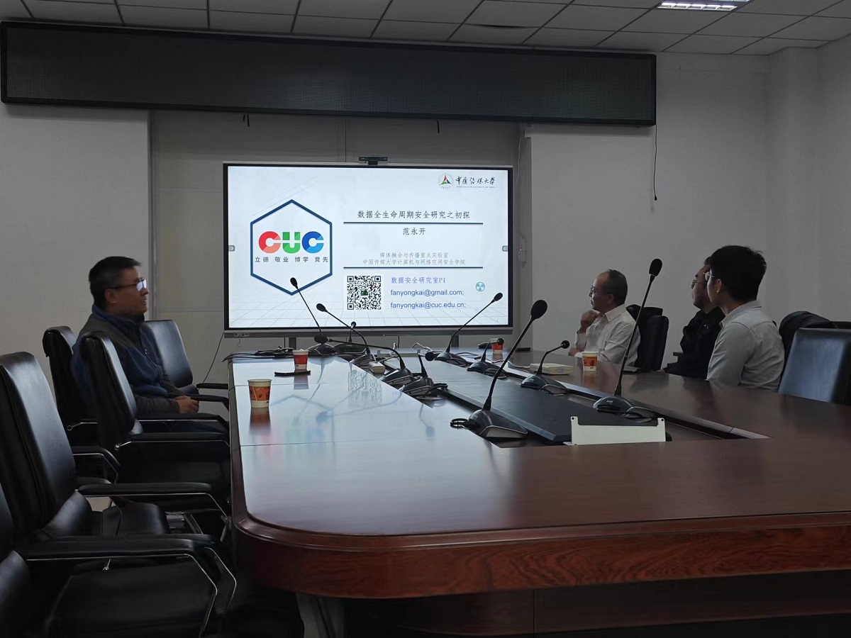 11月6日下午,应永利集团88304官网集团邀请,南开大学教授、博士生导师汪定、中国传媒大学网络与空间安全学院教授姜正涛和中国传媒大学网络与空间安全学院教授范永开在博远楼1023来我院开展学术报告,分别题为“如何评估口令强度评测算法”,“数据全生命周期安全研究之初探”以及“可搜索加密技术与算法”。通信工程专业责任教授张键红主持,通信工程专业30余名研究生参加。
