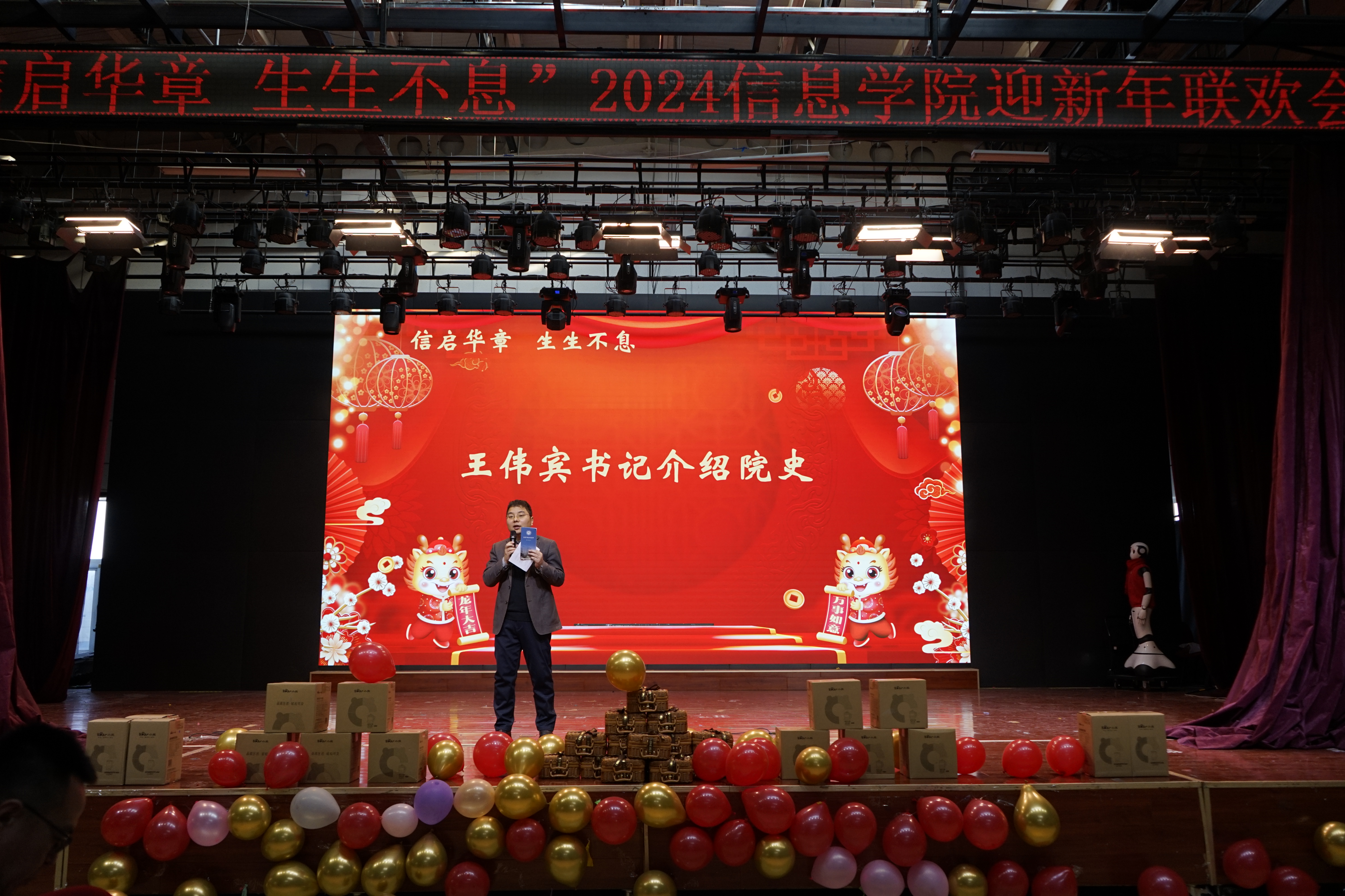 联欢会活动过程中,学院党委书记王伟宾代表学院发布学院院史,他深情回顾了40多年来学院相关专业、学科、人才培养等所取得的标志性成果,让老师们从院史中感受到荣誉感和归属感的同时,更多地汲取未来前进的智慧和力量。学院为2023年退休的老教师以及在校工作满整数年的老师颁发了纪念品。