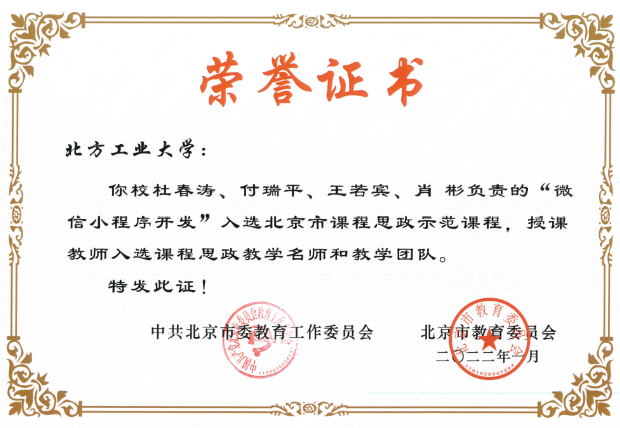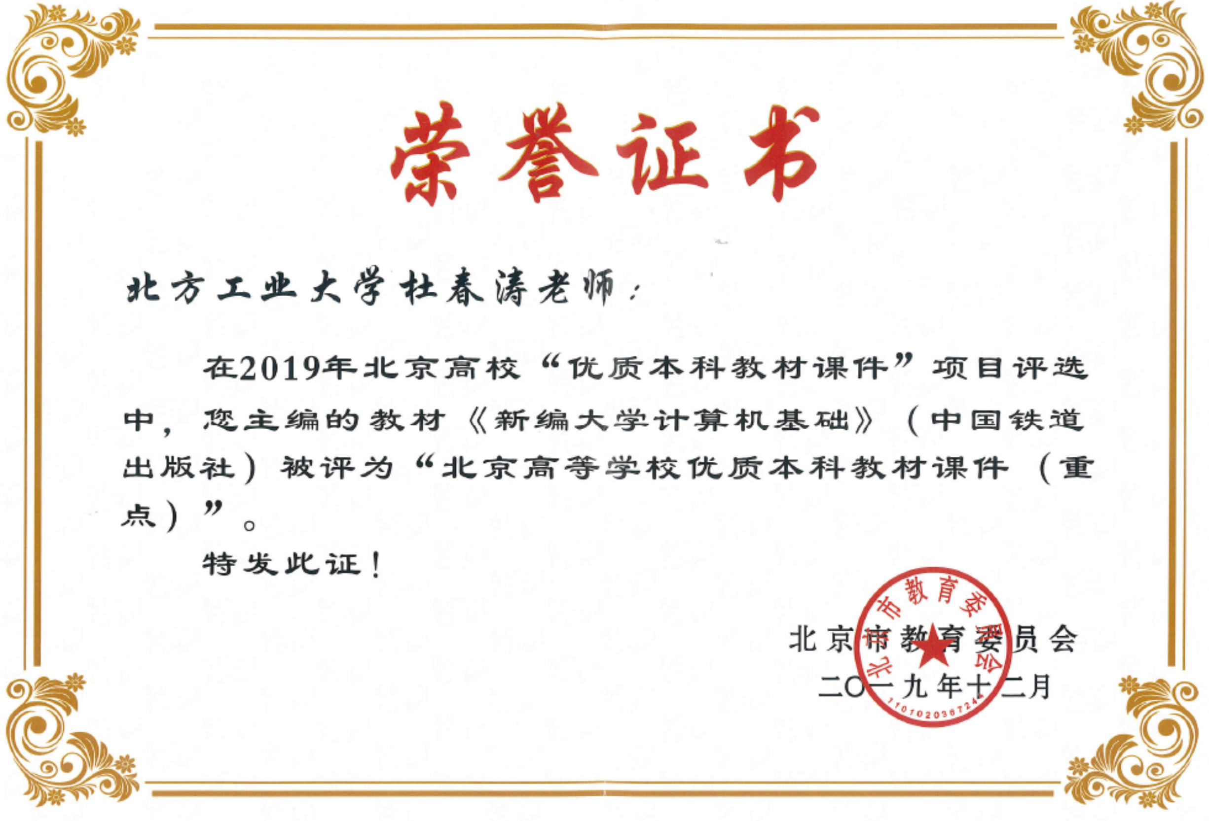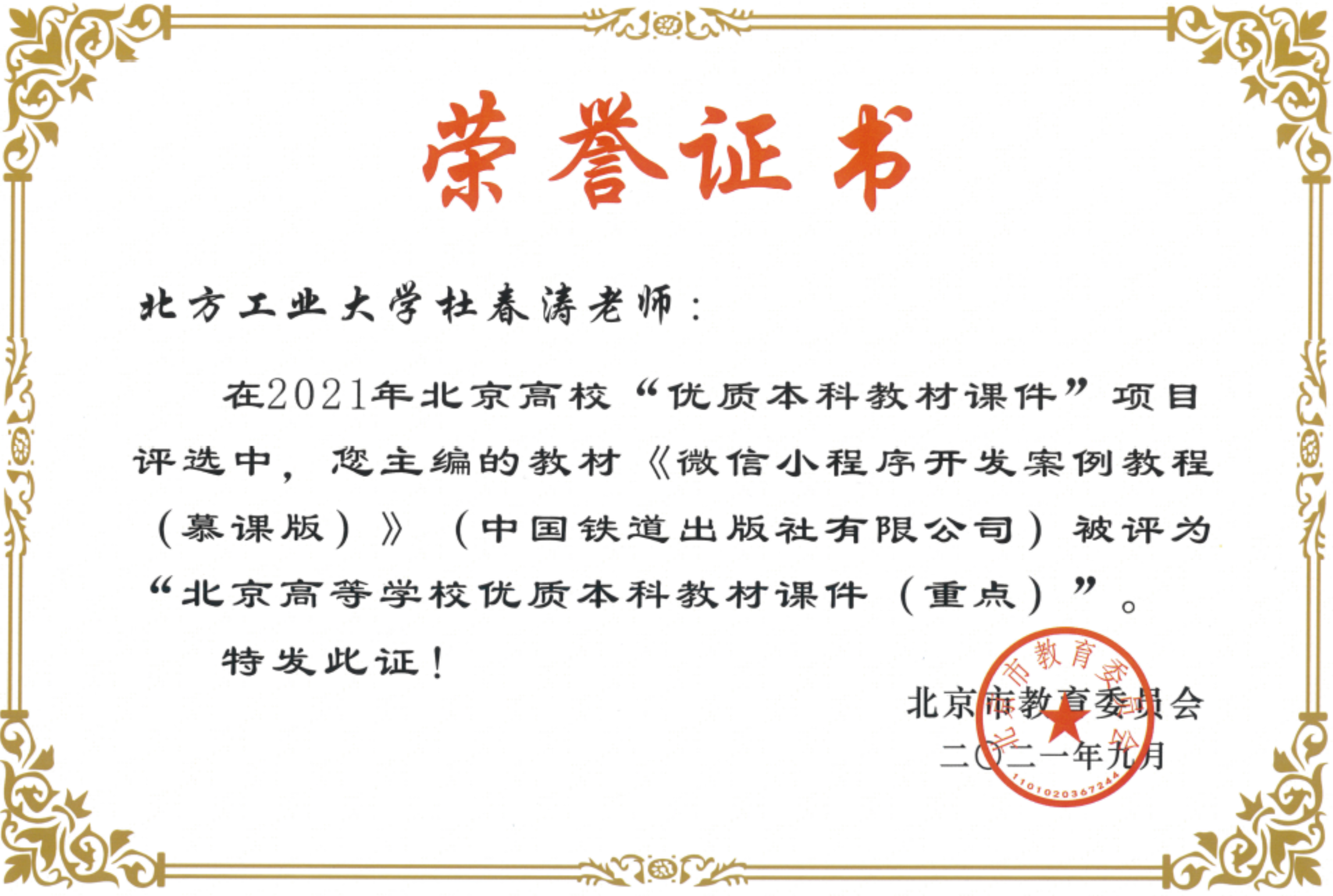 近年来,杜春涛教授主编的教材《新编大学计算机基础》和《微信小程序开发案例教程(慕课版)》,建设的MOOC《Angular Web前端框架开发基础》分别获2019年、2021年和2022年北京高校优质教材课件(重点),主讲的《Java程序设计》课程获北京高校优质本科教案,申报的教学成果《产教融合,德能双育,应用型高校大学计算机虚拟教研室“金课”建设与实践》获2021年北京高等教育教学成果一等奖。