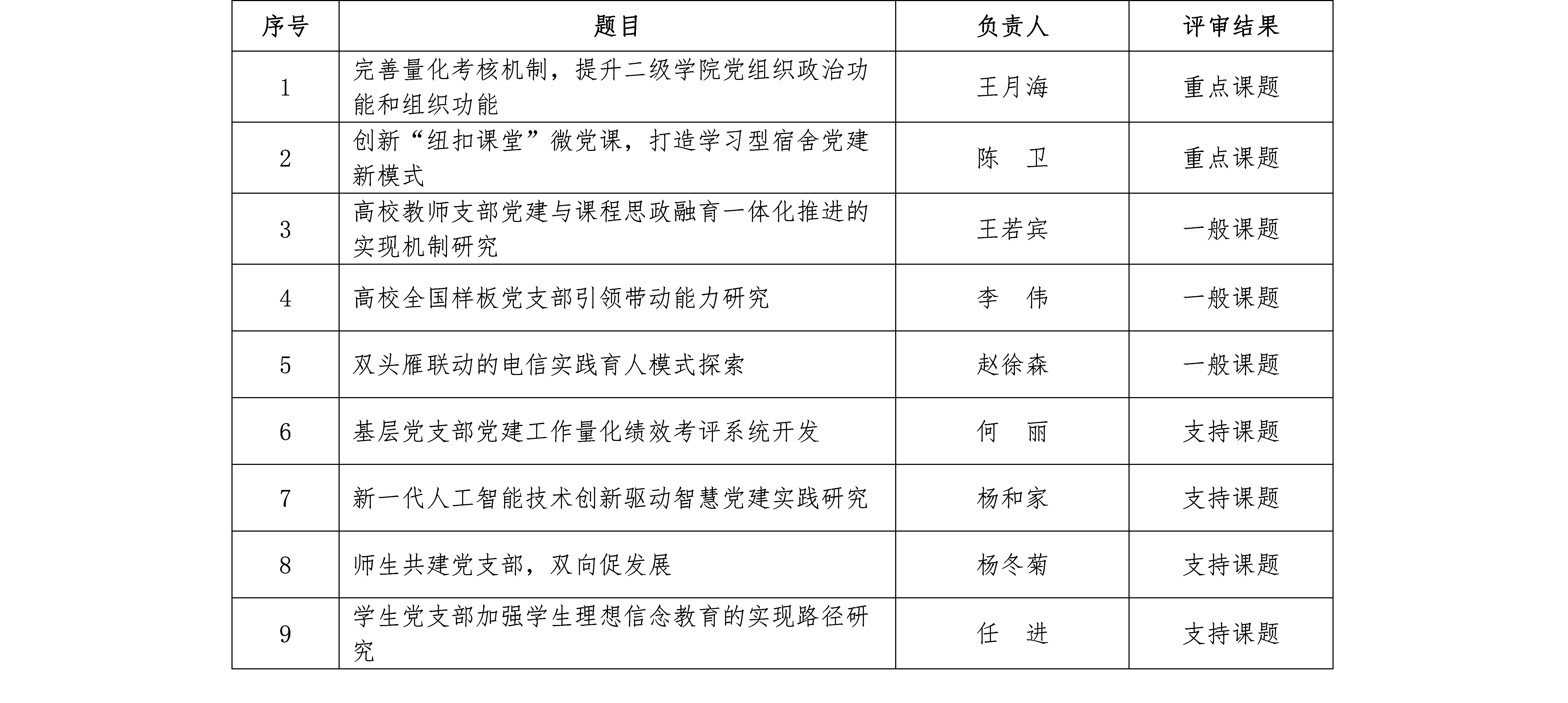 根据组织部《关于申报2023年度党建研究课题的通知》要求,经个人申报、二级单位党组织审核推荐、校内专家评审,评出校内重点课题5项,一般课题9项,支持课题19项。我院重点课题2项,一般课题3项,支持课题4项,共9项党建研究课题立项(详见附件1),课题研究期限为1年。